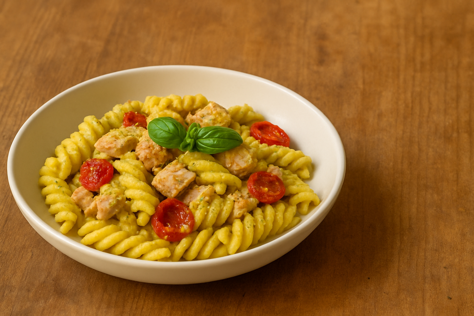 Fusilloni al tarantello di tonno rosso con pesto di pistacchio e ciliegino semisecco